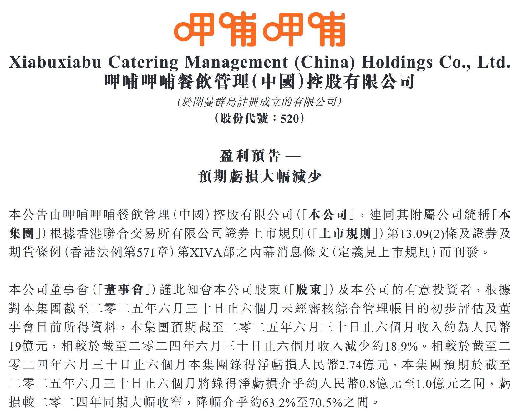 8月4日晚间,呷哺呷哺(HK00520,股价0.77港元,市值8.36亿港元)发布截至2025年6月30日止六个月的业绩预告。公司预计上半年实现收入约为19亿元,同比减少约18.9%;净亏损预计将收窄至0.8亿元至1.0亿元之间,而2024年同期则为亏损2.74亿元。